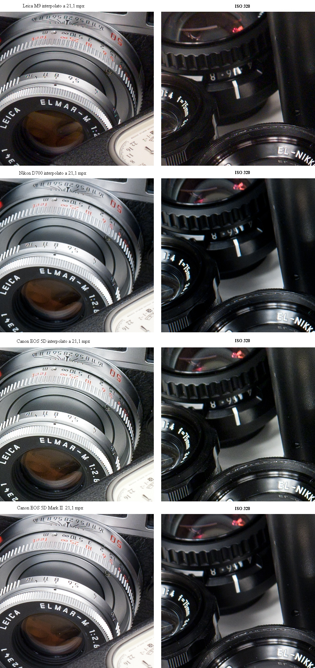 Su questo specifico fronte la Leica M9 viene progressivamente distanziata dagli altri modelli: a 320 ISO regge ancora decorosamente ma a sensibilità via via superiori la granulosità ed il chroma noise divengono evidenti; la D700 conferma la fama acquisita da questo pacchetto gia all'esordio sulla D3 mentre anche le Canon forniscono risultati molto buoni: la 5D Mark II eguaglia praticamente le prestazioni della Nikon, pur garantendo una maggiore densità sullo stesso formato di sensore ma anche la EOS 5D, nonostante la sua anzianità, è ancora attuale.