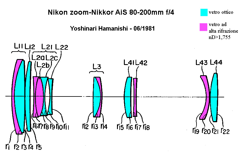 Lo schema ottico dello zoom-Nikkor 80-200mm f/4,5 prima versione era sofisticato