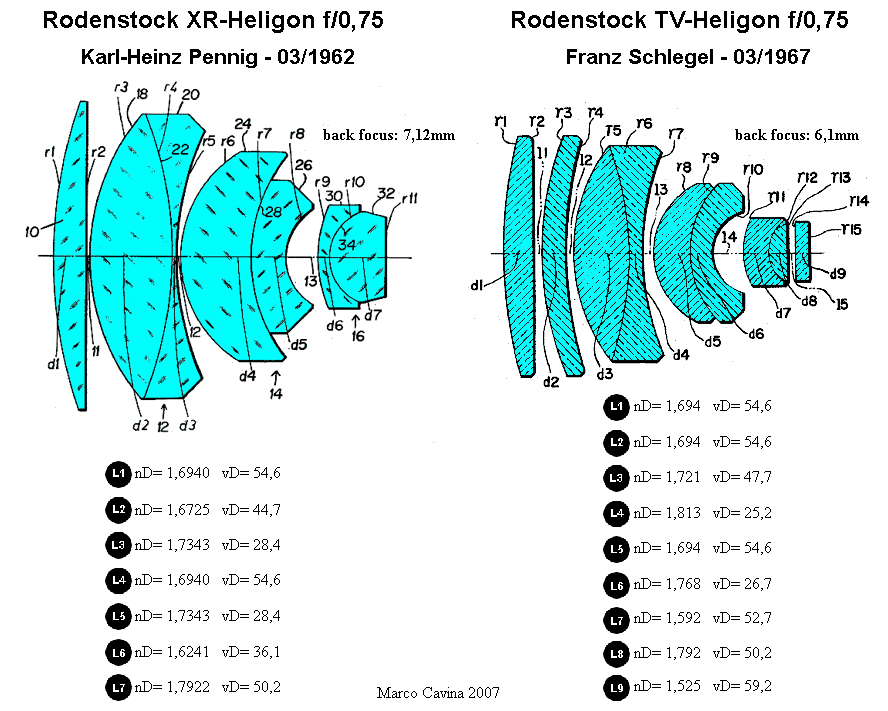 gli inediti schemi ottici dei Rodenstock XR-Heligon f/0,75 e