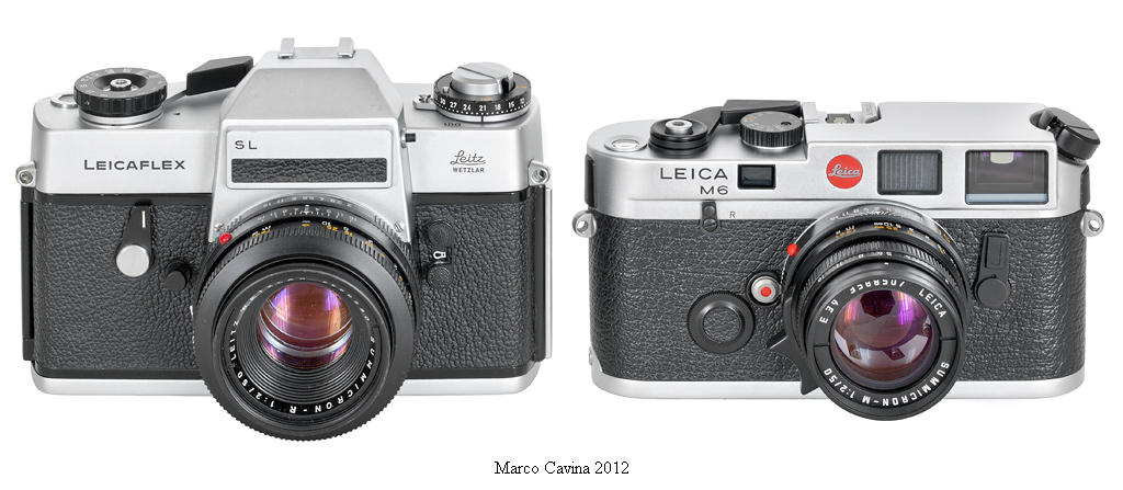 Anche senza abbandonare l'ambito Leitz, la stessa Leicaflex SL, qui abbinata alla M6 Panda, presenta a sua volta gran parte degli elementi assemblati sul corpo in finitura nera, compreso - in quest'esemplare del 1973 - il pulsante per la chiusura manuale del diaframma.