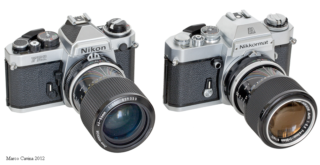 Un approccio similare si può visualizzare anche nei prodotti di altri Brand, come ad esempio la Nippon Kogaku: questa Nikkormat EL del 1974 presenta ancora elementi funzionali rifiniti in cromo lucido, mentre gli analoghi dettagli degli epigoni successivi, come la Nikon FE2 del 1986 che le sta accanto, sono stati convertiti al nero, estendendo il look bicolore persino al carter del pentaprisma, parzialmente rivestito con vulcanite scura: pur condividendo con la Nikkormat cromatura del corpo, fisionomia ed architettura, il modello più recente appare a prima vista più moderno ed aggressivo proprio grazie a questi dettagli a contrasto.