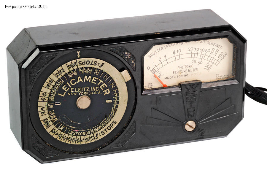 Sempre nel 1934 appare questo esposimetro dell’americana Weston di Newark, NY, che per la prima volta riporta la scritta Leicameter. Possedeva una forma rotonda a forma di strumento nautico e veniva inserito in un astuccio protettivo metallico. La cellula al selenio era da un lato mentre dall’altro vi era il disco di controllo in gradi Schneider, con lancetta in rosso. Questa parte era coperta da un vetro, che rappresentava il punto debole dello strumento. Possiede un peso di 200g ed era catalogato col codice LEDZH.